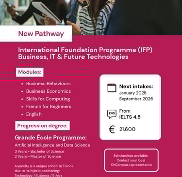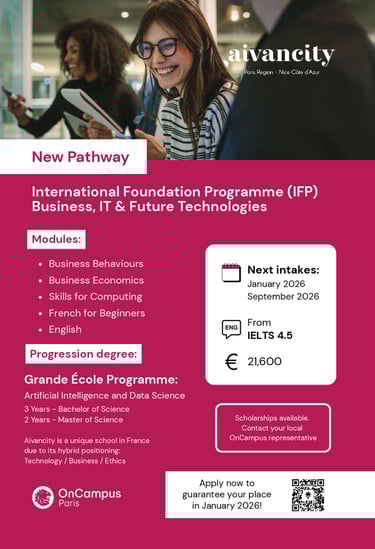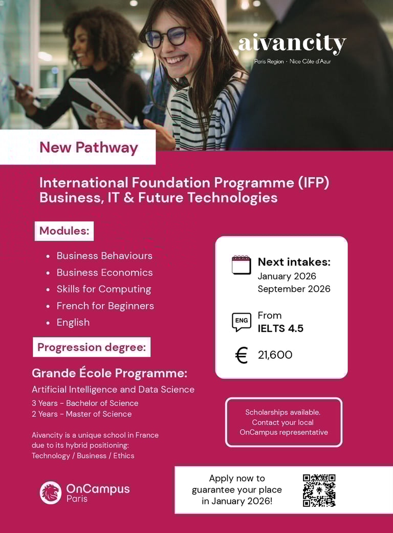 Sinh viên quốc tế chưa đáp ứng đủ điều kiện ngôn ngữ hoặc học thuật để vào thẳng chương trình đại học của Aivancity có thể bắt đầu với chương trình Foundation hoặc Undergraduate Pathway tại ONCAMPUS Paris.