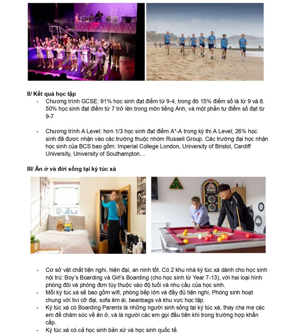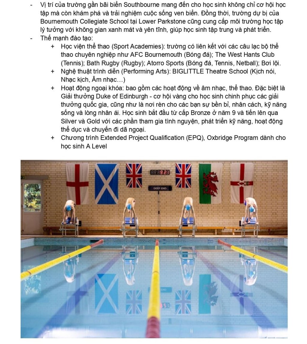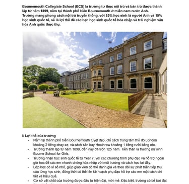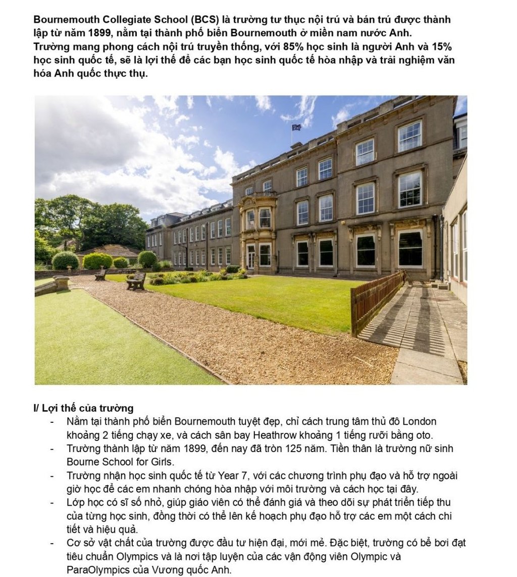 Trường nội trú thành lập năm 1899, nằm tại thành phố biển Bournemouth tuyệt đẹp, không gian xanh, cách London 2 tiếng chạy xe. Nhận học sinh Việt Nam từ lớp 6. Cơ sở vật chất được đầu tư mới hiện đại. Hơn 1/3 học sinh đạt điểm A*-A trong kì thi A level.