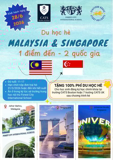 Mùa hè 2026, CATS Global Schools chính thức giới thiệu chương trình Du học hè Malaysia & Singapore dành cho học sinh từ 11–17 tuổi, mang đến cơ hội học tập quốc tế chuẩn mực kết hợp trải nghiệm văn hóa – khám phá toàn cầu chỉ trong 1 tuần (28/06 – 05/07/2026).