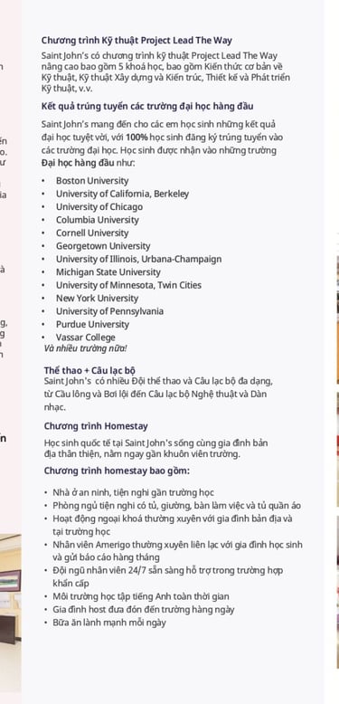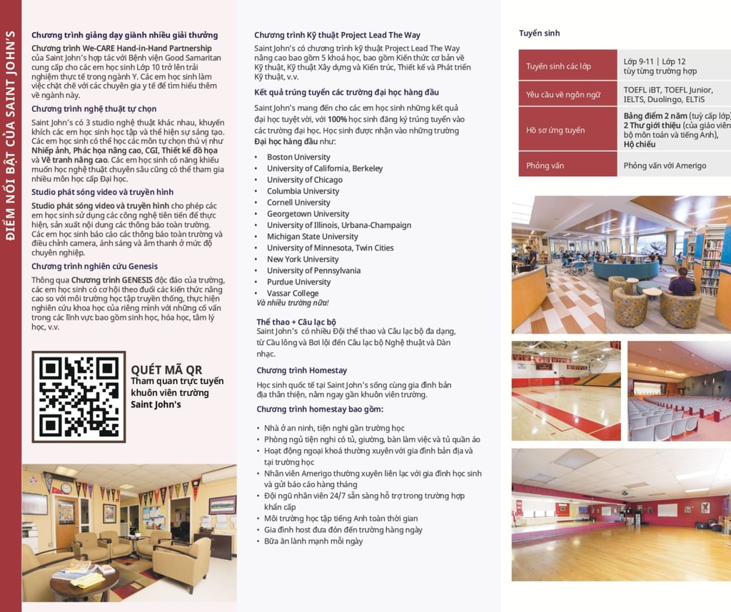 Trường THPT Saint John mang đến cho các em học sinh một nền giáo dục ưu tú với kết quả học tập vượt trội - trường có tỷ lệ 100% học sinh trúng tuyển Đại học và các khóa học sinh tốt nghiệp gần đây nhất được nhận tổng số học bống lên tới 54,5 triệu USD!