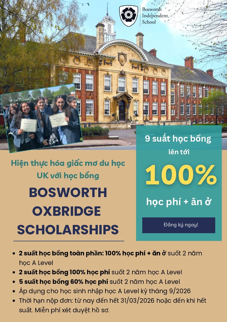 Chúng tôi vô cùng vui mừng thông báo các suất học bổng 100% học phí + ăn ở tại một trong các trường trung học hàng đầu đối tác của chúng tôi, Bosworth Independent School.