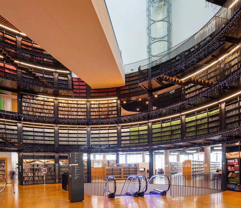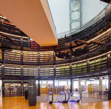 Thư viện chính rộng lớn, tích hợp không gian học nhóm và công nghệ số tiên tiến.